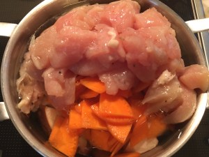人参と大根、4等分した椎茸、一口サイズに切った鶏肉を入れて中火にかける