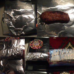 焼けたら、アルミで二重に巻いて、液ダレ防止のビニールに入れます